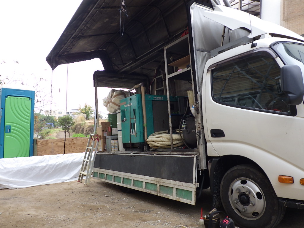 施工の際には材料のはいったドラム缶、圧縮空気をつくるなどする