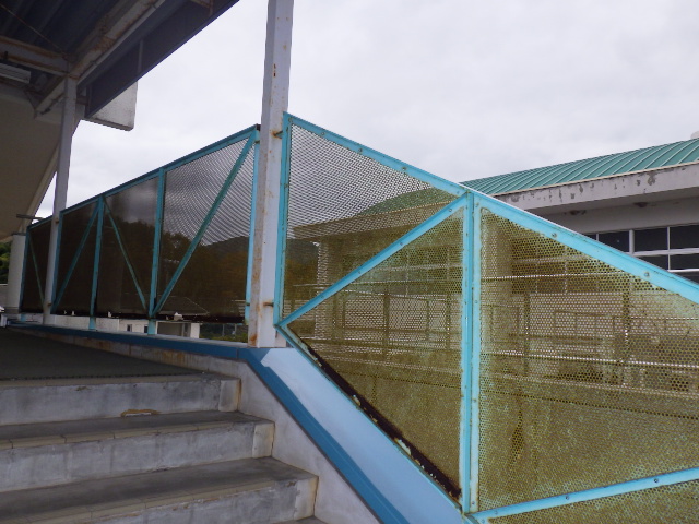 さて夏休みの学校修繕です。渡り廊下のフェンスの足もとの鉄骨が腐食していて