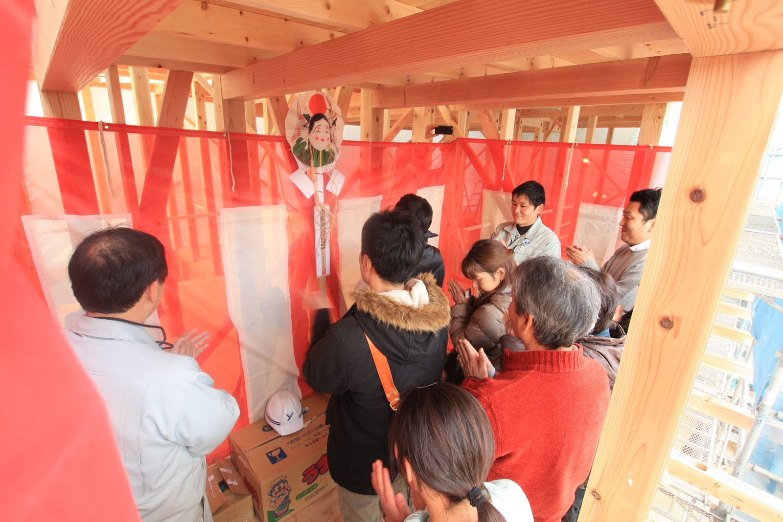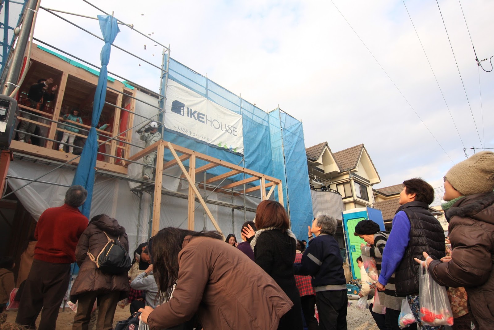 作業終了後、上棟式を行い、お施主様の御厚意で餅まきを行いました。
