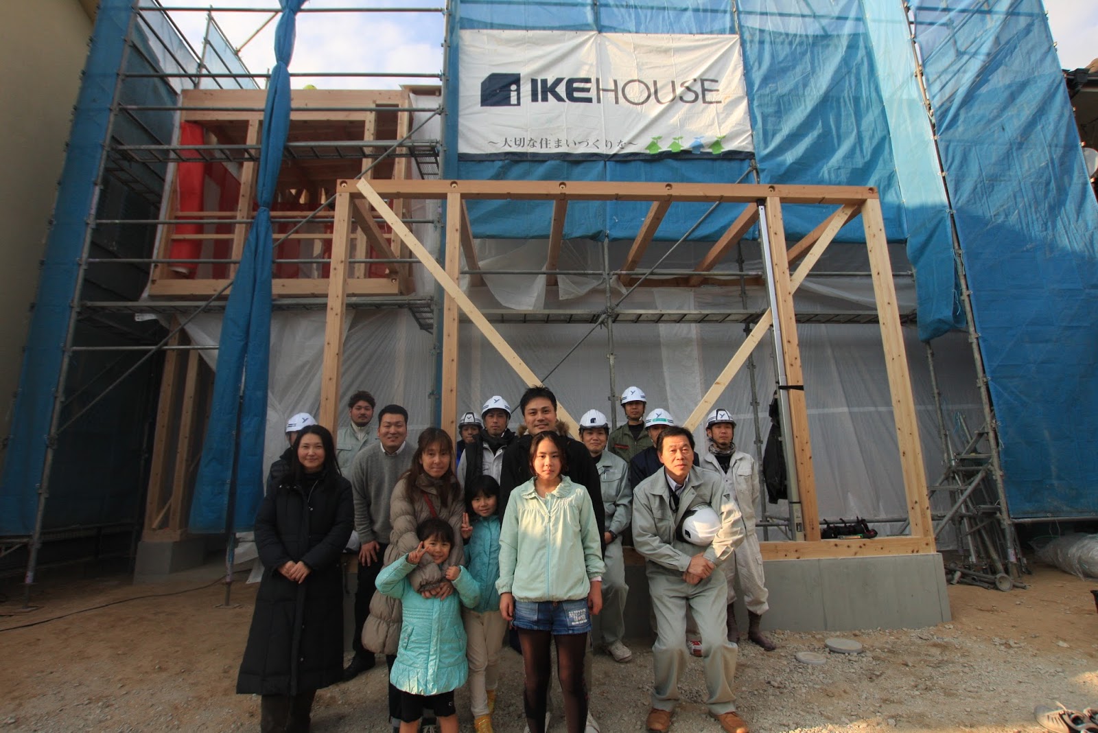 お施主様とIKEHOUSEスタッフ、上棟で作業をして頂いた大工さんです。