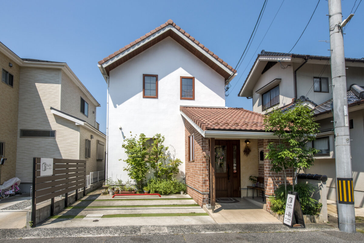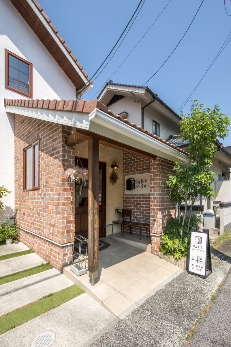 白い外壁に煉瓦と緑が映える自宅を兼ねた小さなパン屋さん