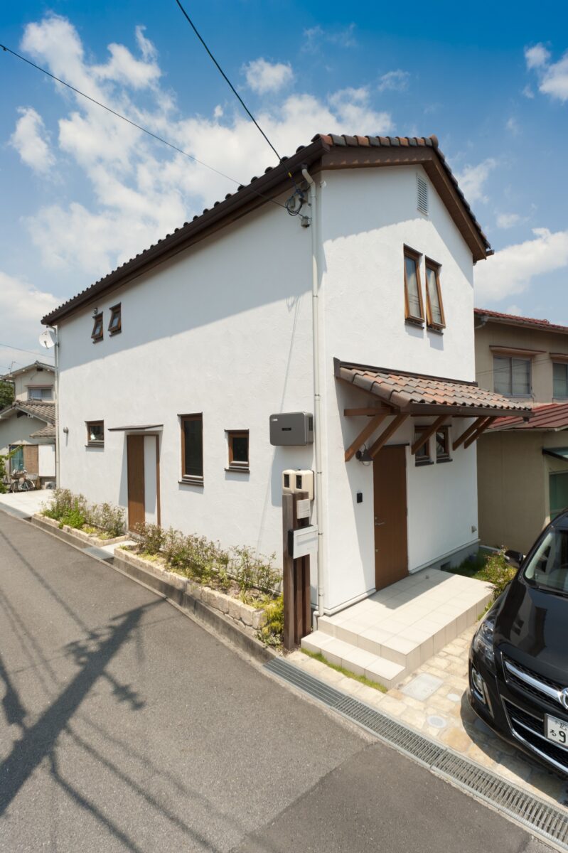 白い漆喰の壁に色に変化のある瓦屋根が愛らしい外観。