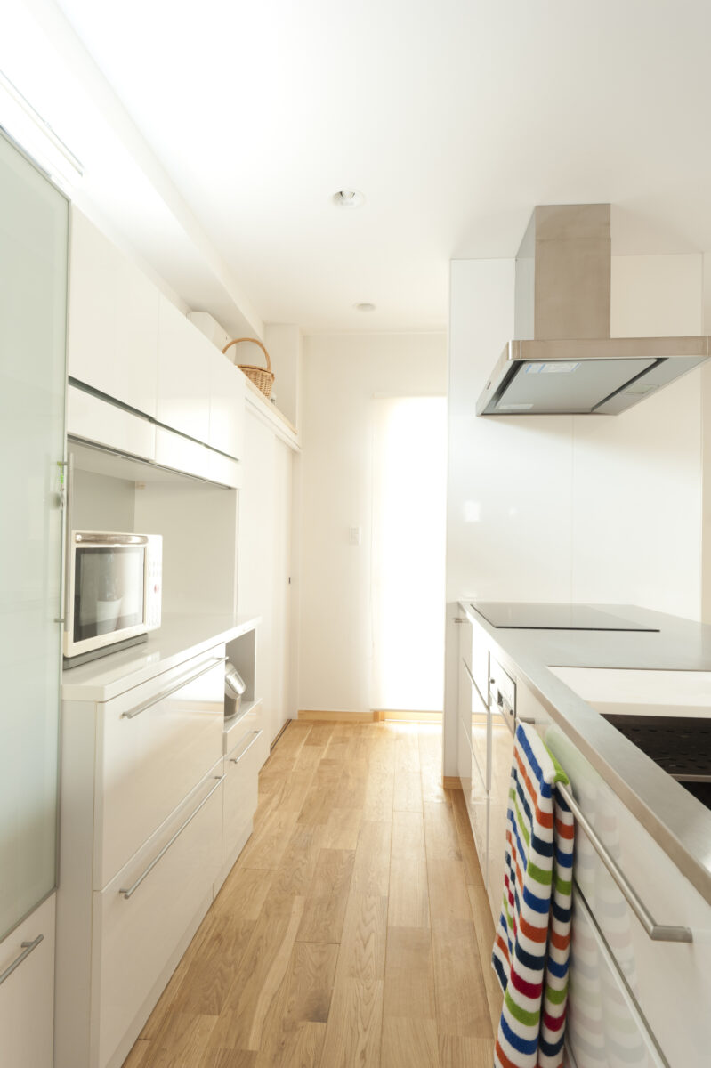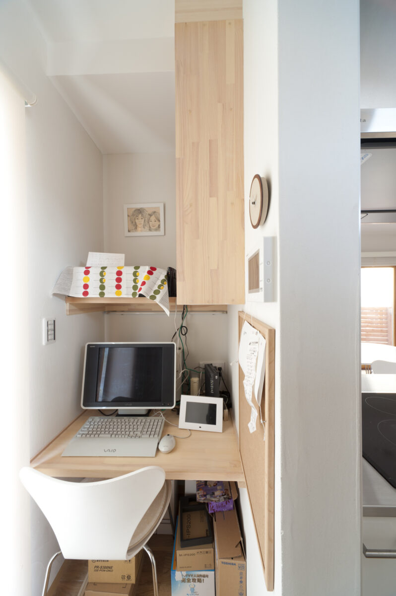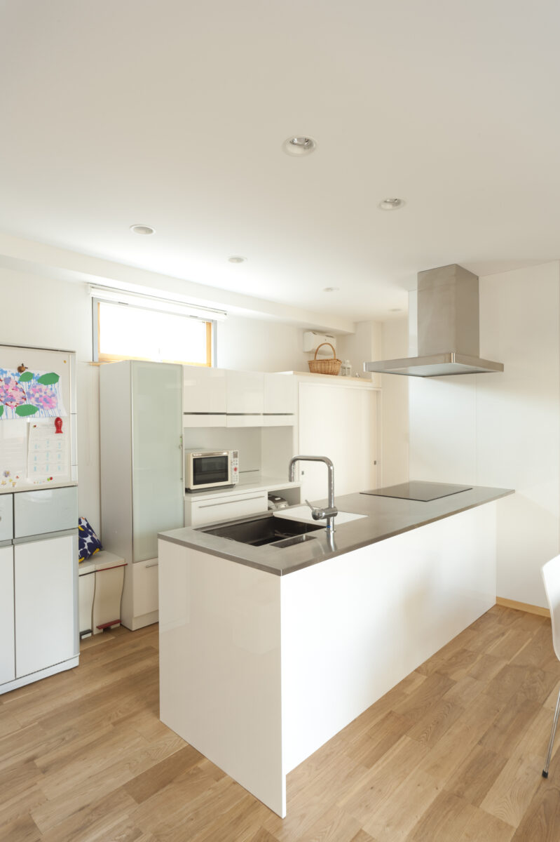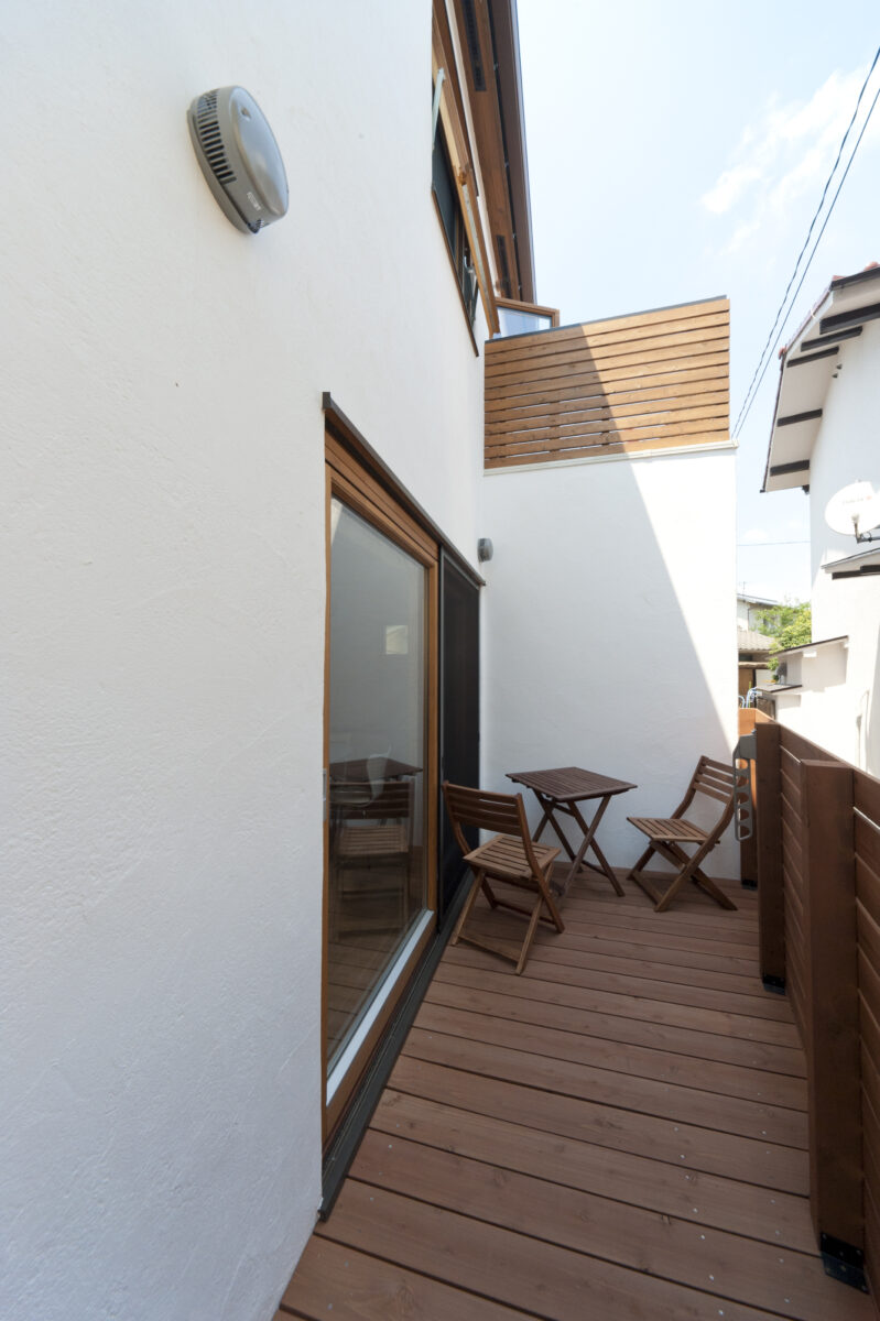 ダイニングからつながるようにウッドデッキを設けて、キッチンはパントリーやデスクスペースが充実しており、狭小地に建てられているとは思えない印象です。