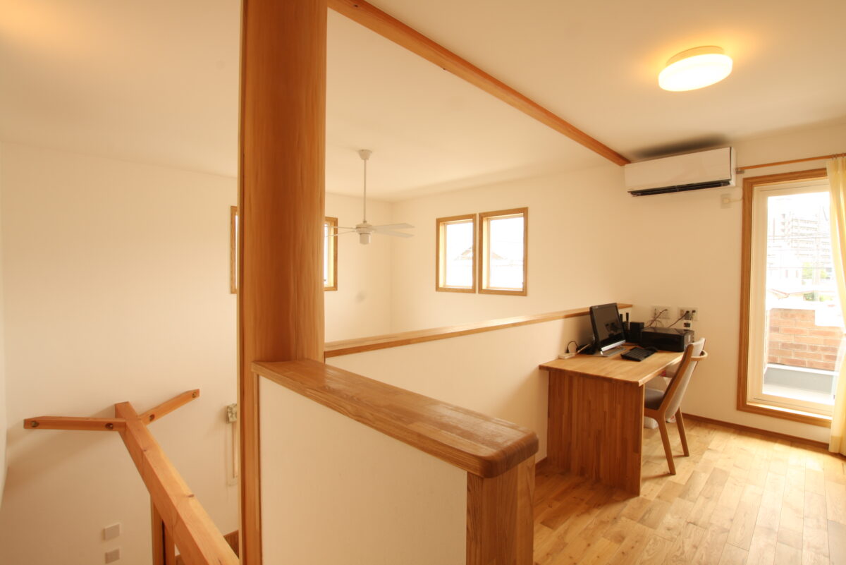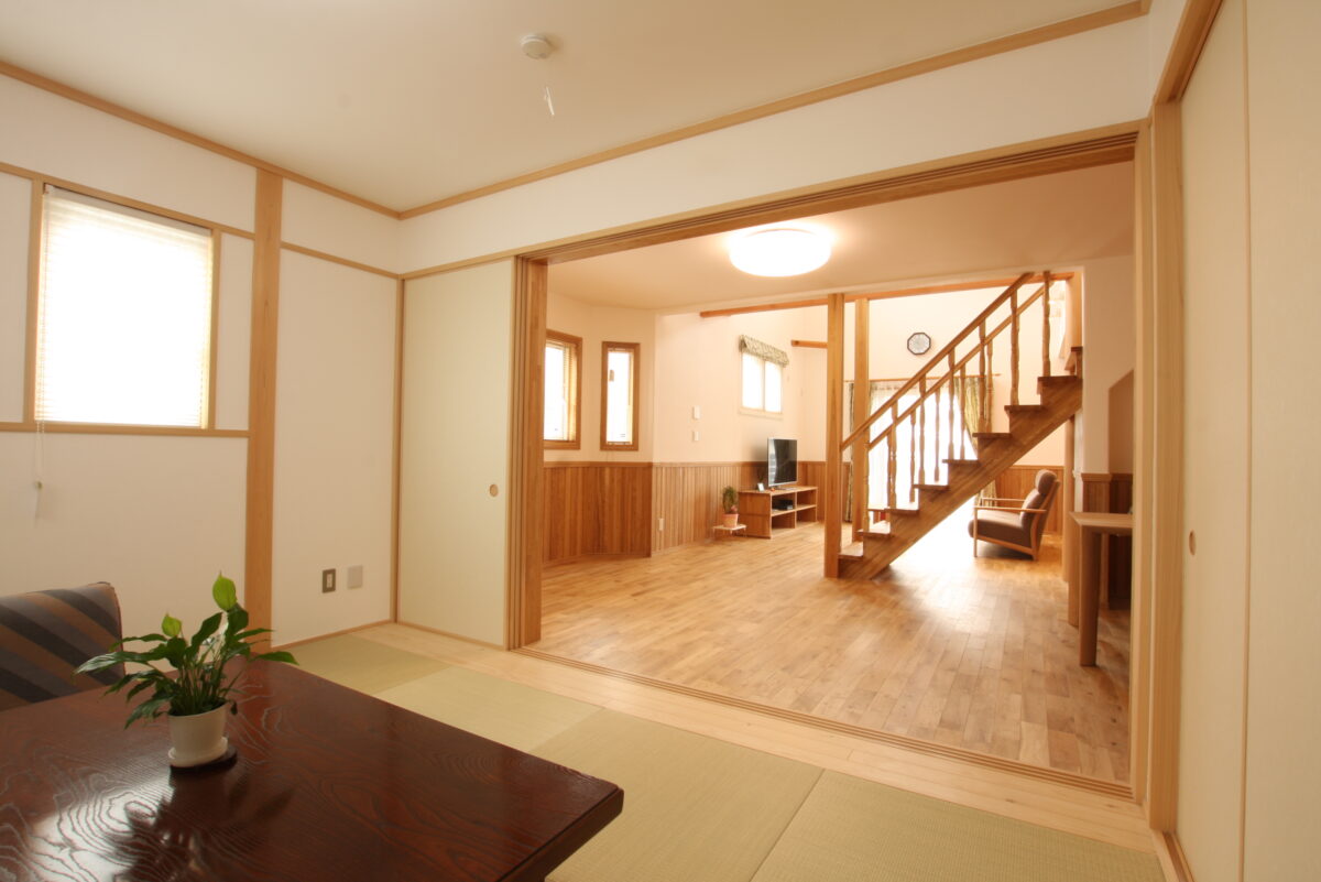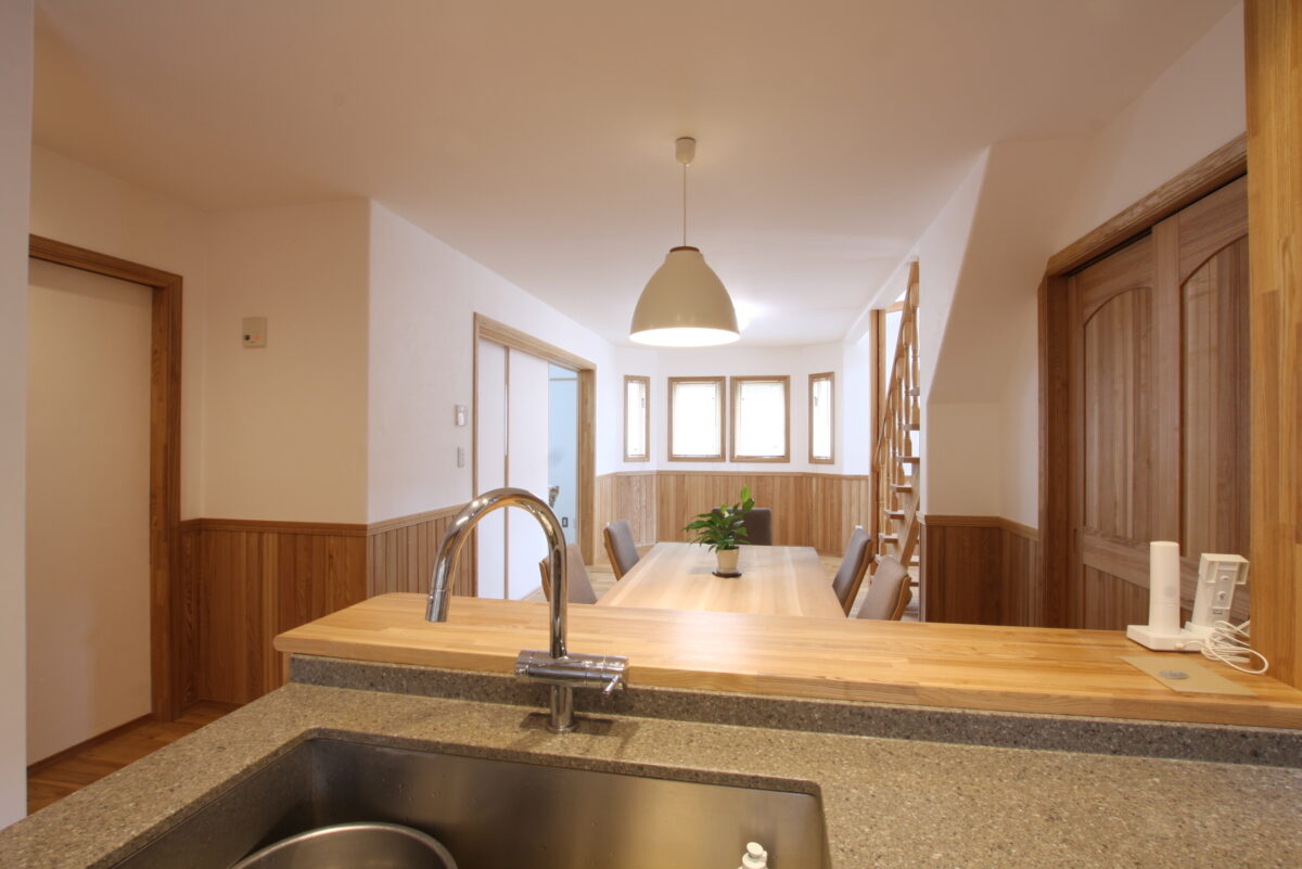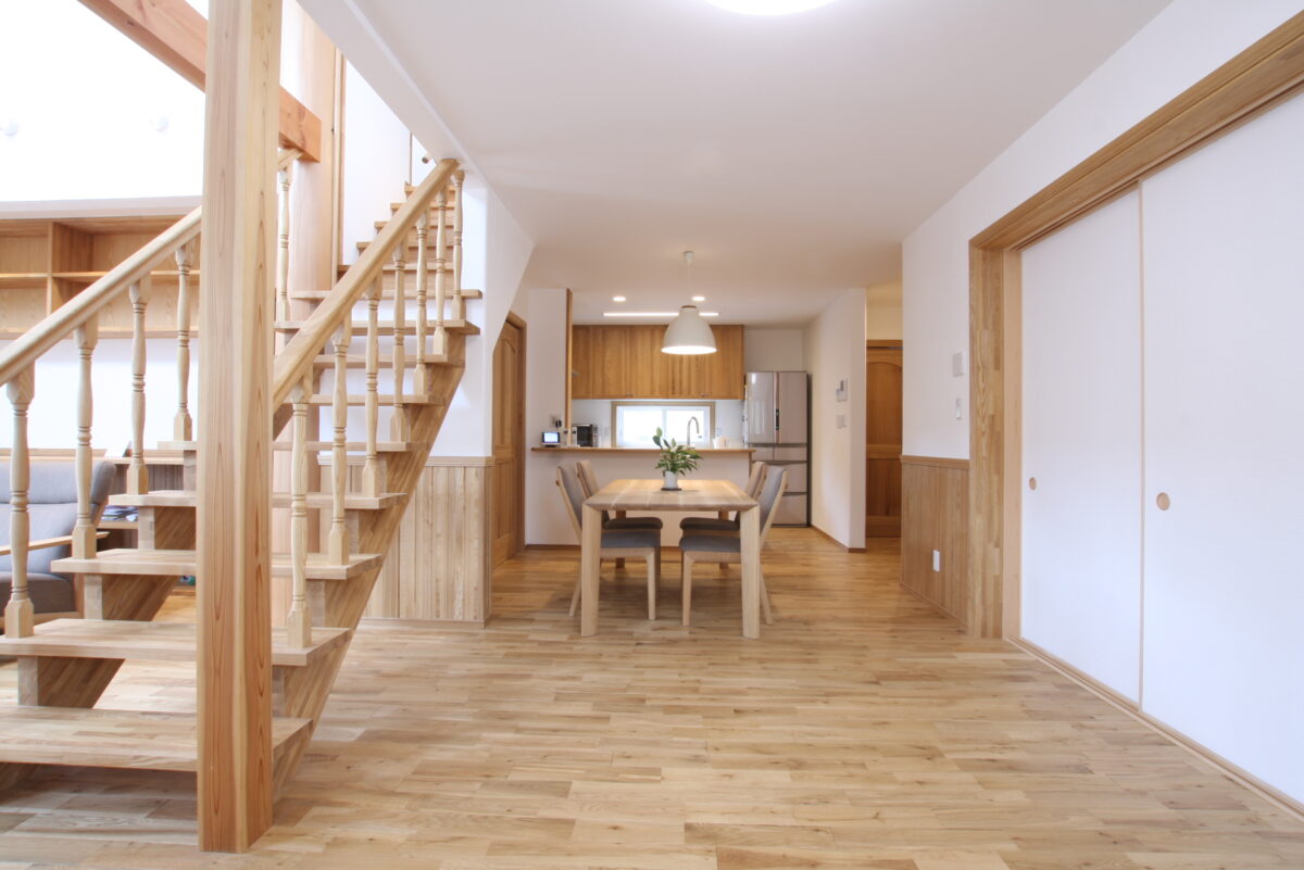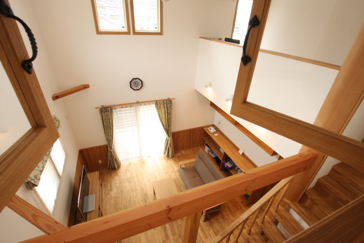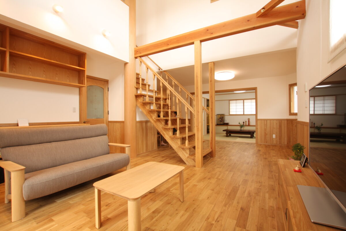 大黒柱を中心に回廊できるLDKは、吹き抜けを設けた開放的な空間で広がりが感じられます。
