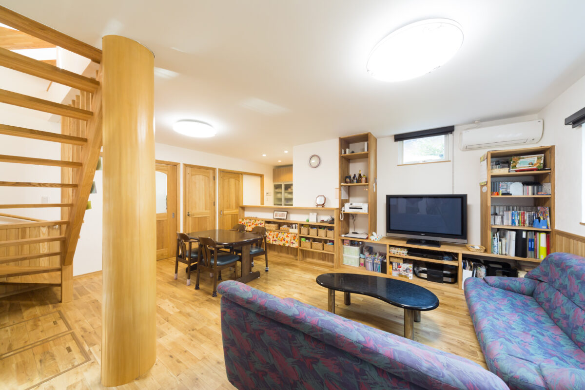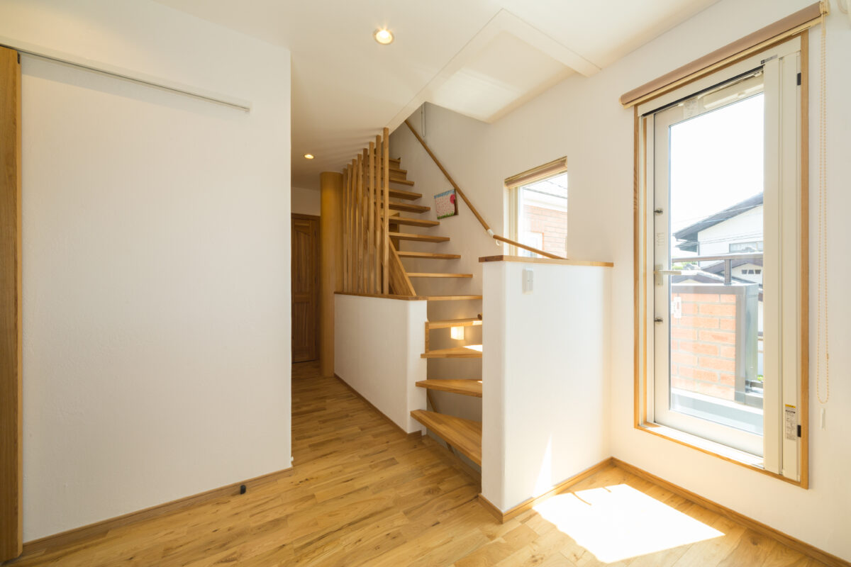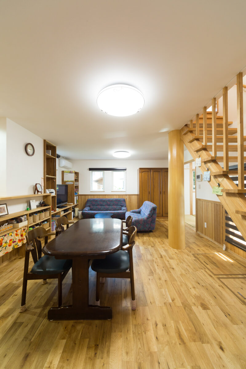 大黒柱に回り込むように設けたスリット階段は、空気循環とデザイン性が向上しています。